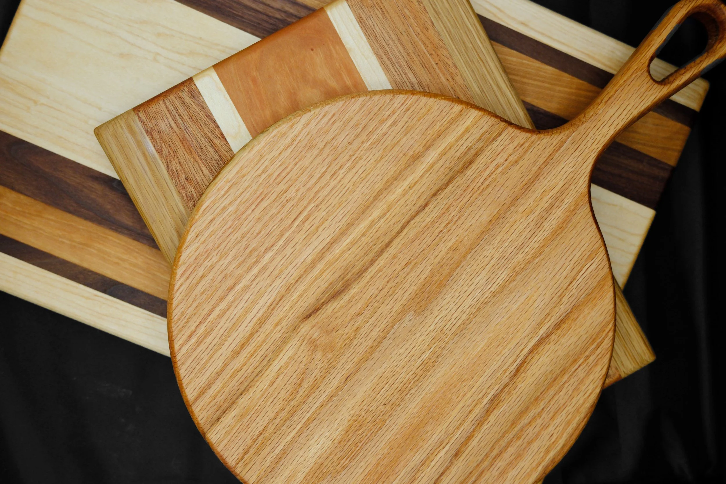 Our custom cutting boards offer various shapes—rectangles, squares, rounds, ovals, and unique forms. Patterns include end-grain checkerboards, stripes, routing, and engravings. Sizes range from small prep boards to large chopping surfaces. Crafted from premium hardwoods, each board is durable and finely finished for daily use or special occasions. Price would range from $40-$200 depending on size and detail.