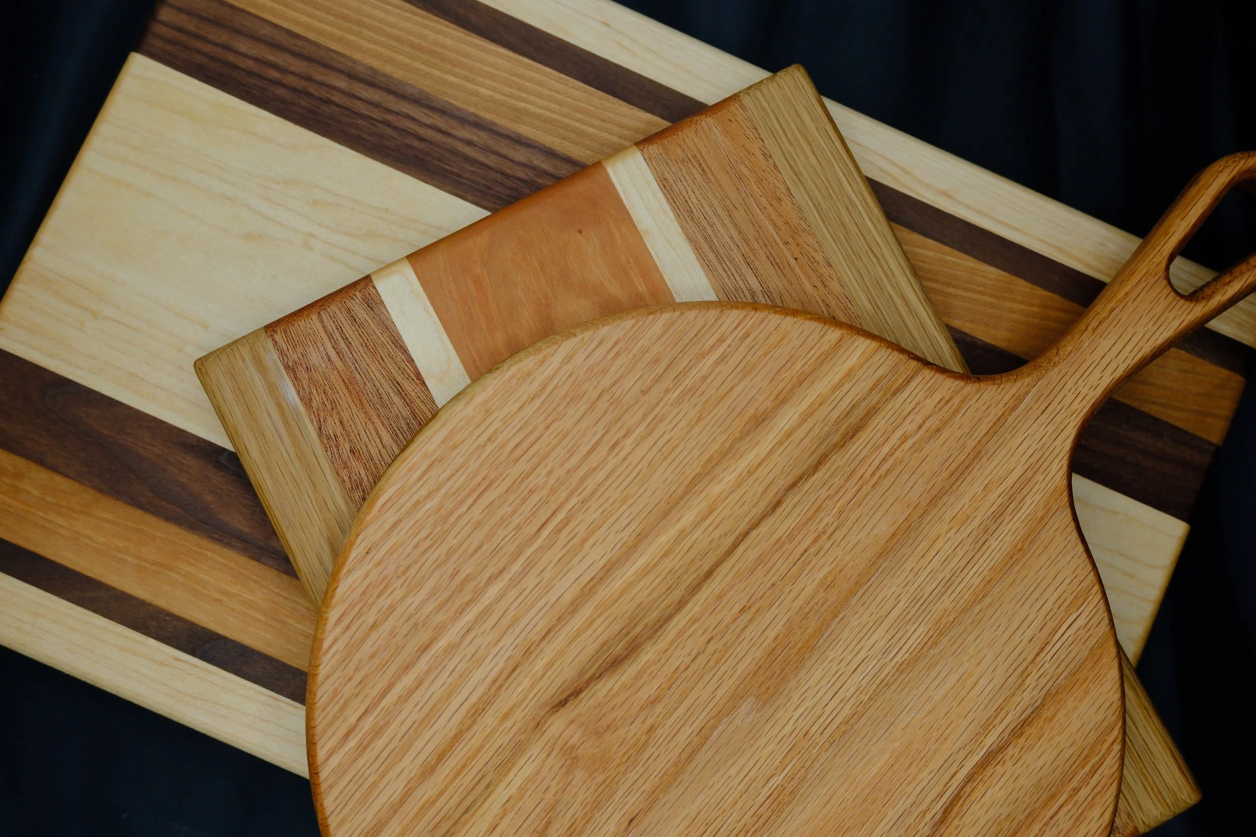 Our custom cutting boards offer various shapes—rectangles, squares, rounds, ovals, and unique forms. Patterns include end-grain checkerboards, stripes, routing, and engravings. Sizes range from small prep boards to large chopping surfaces. Crafted from premium hardwoods, each board is durable and finely finished for daily use or special occasions. Price would range from $40-$200 depending on size and detail.